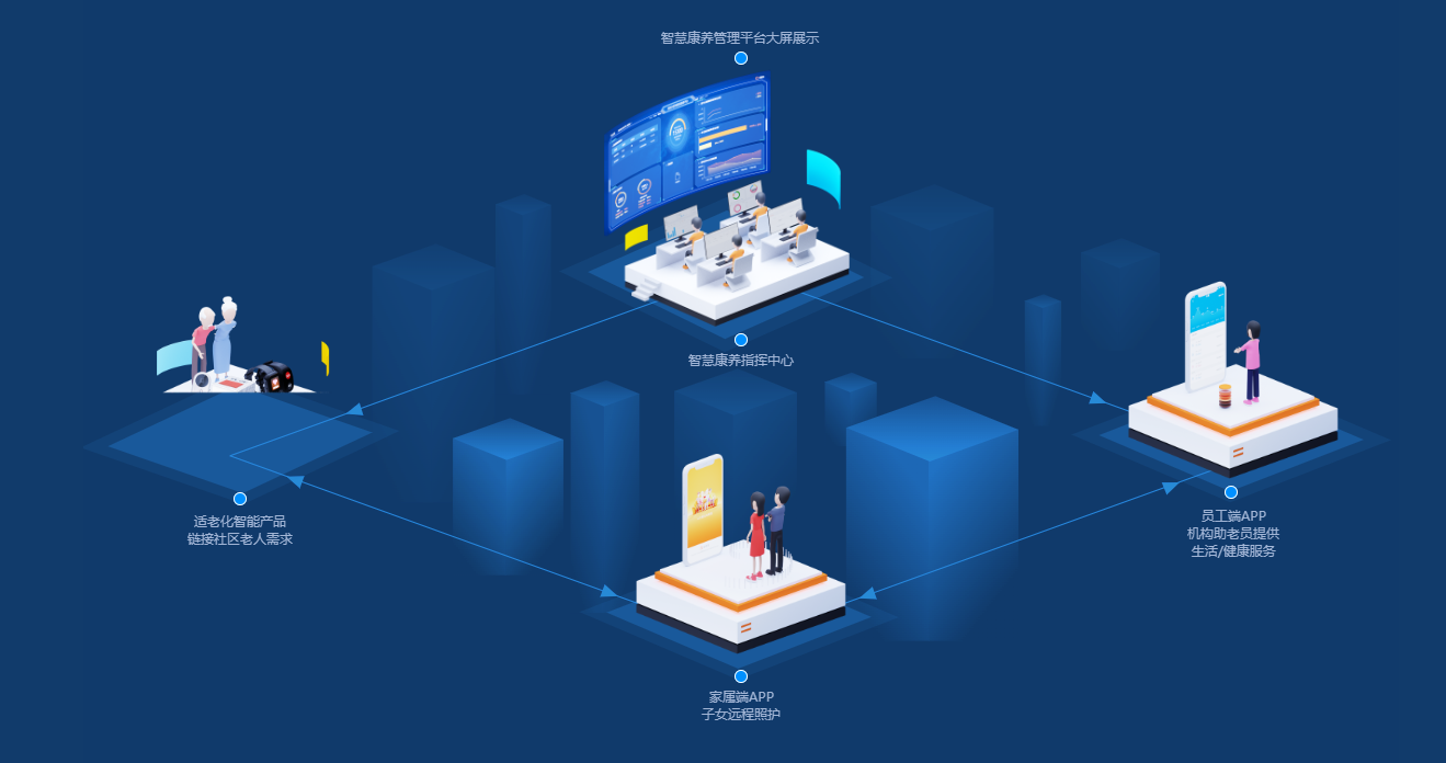 美颐康尔智慧康养数字化管理平台主要是以社区/居家为依托的一站式服务融合,集服务、营销、管理、运营于一体的智慧康养综合大数据平台。以美颐康尔适老化智能硬件为入口精准化需求服务供给,以平台为支撑的多维度管理流程,以APP应用的移动式运营体验,帮助服务机构将优质的产品和服务,传递给社区长者;通过PC/移动多平台数据同步,连通机构各部门、动态掌握长者的生活、健康、安全等状况,让长者、医生、服务商、子女长者及长者家属,形成一个完整的智慧康养服务闭环。