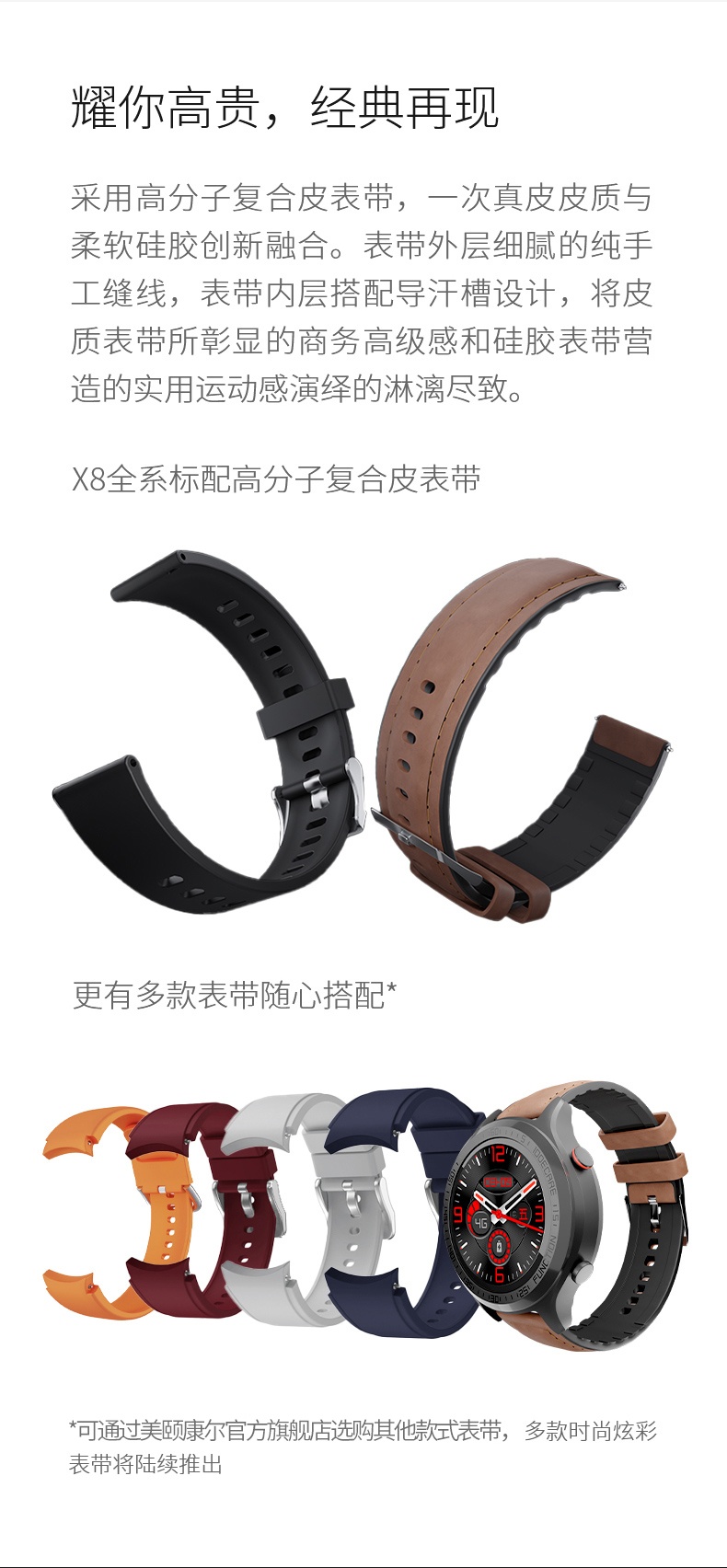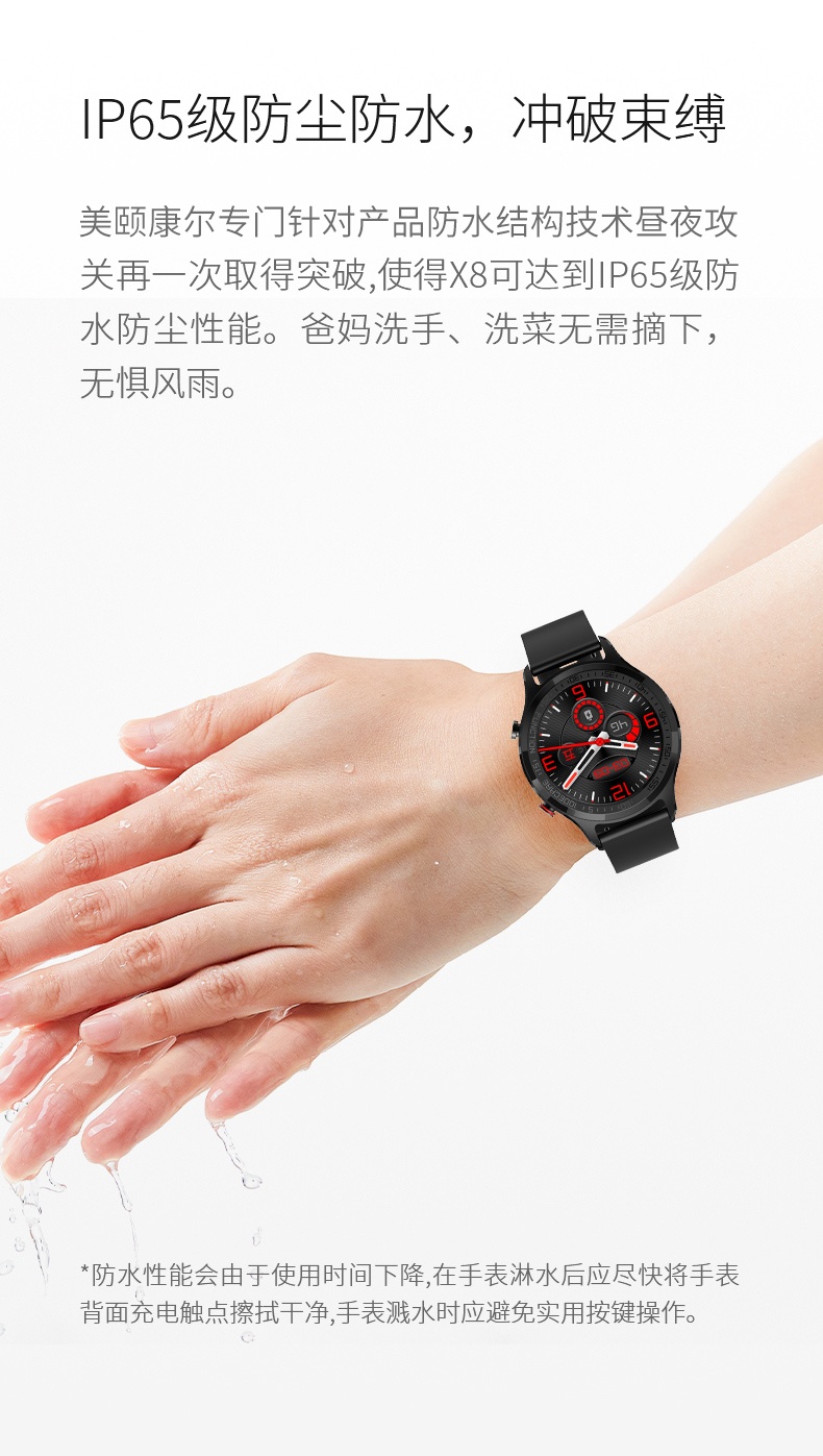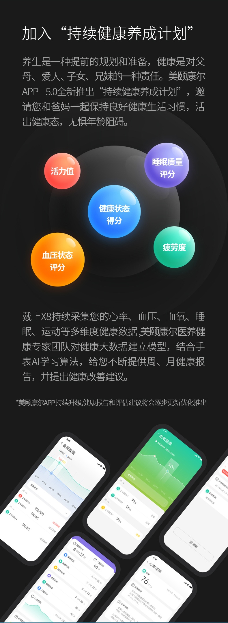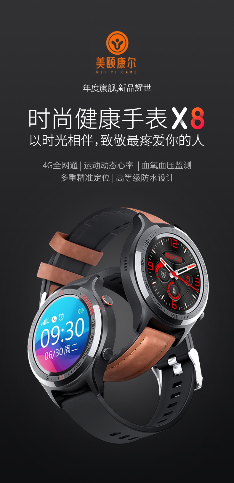 美颐康尔活力智护X8主要面向活力低龄长者的健康监测及运动训练需求而设计,是全新X系列的旗舰机型。是一款实用与潮流兼备的高性能高品质健康手表。