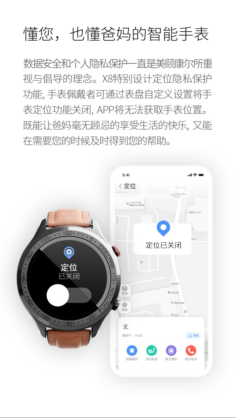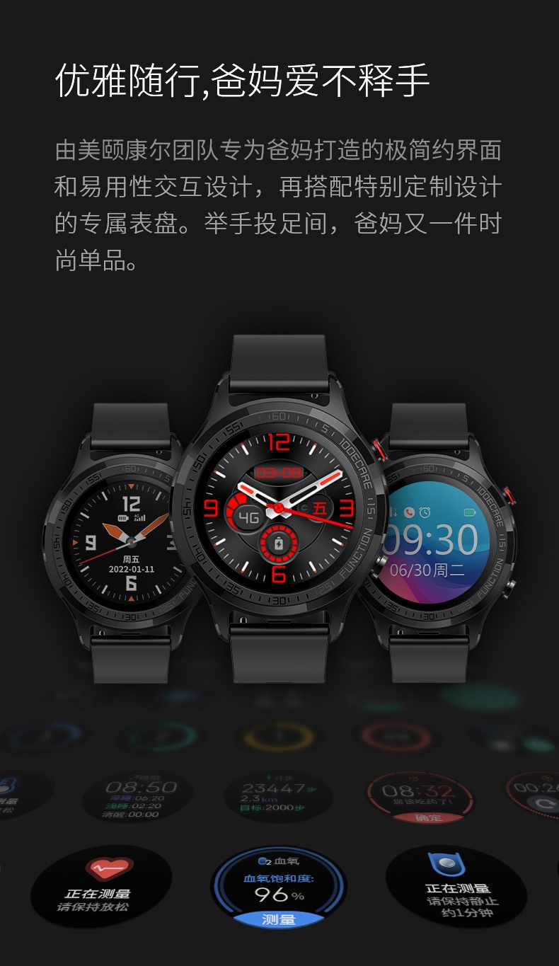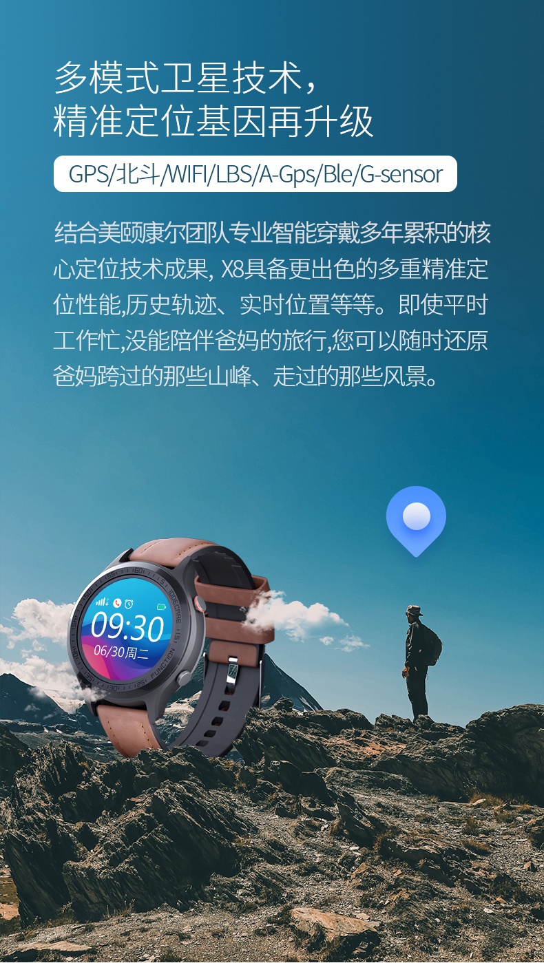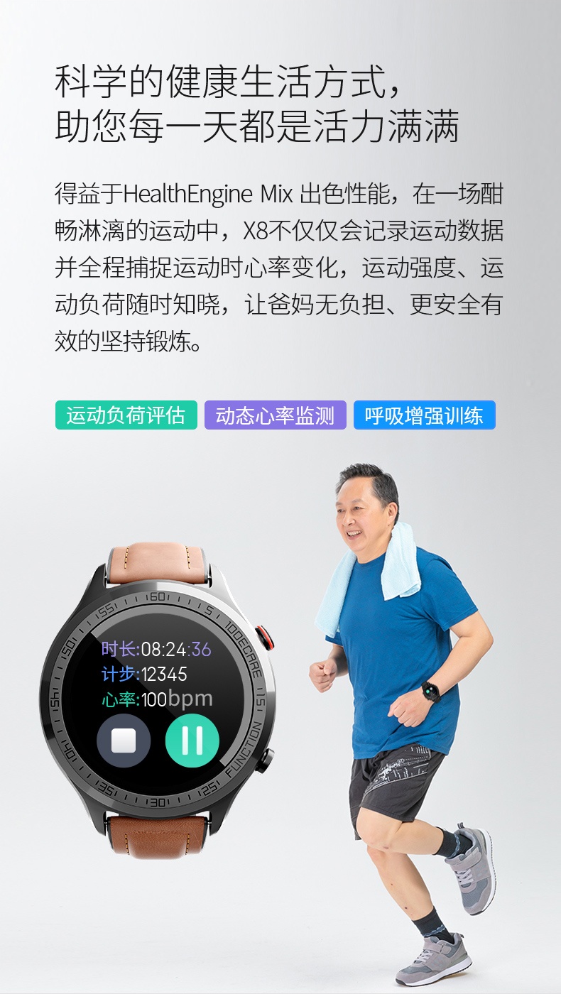 美颐康尔活力智护X8主要面向活力低龄长者的健康监测及运动训练需求而设计,是全新X系列的旗舰机型。是一款实用与潮流兼备的高性能高品质健康手表。