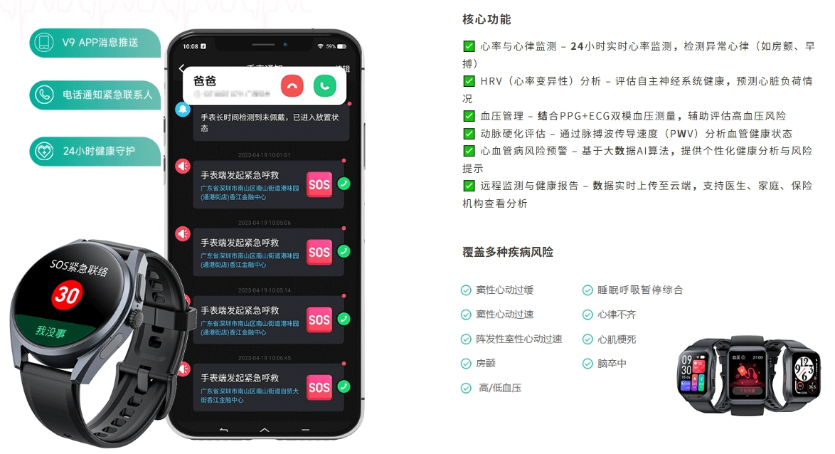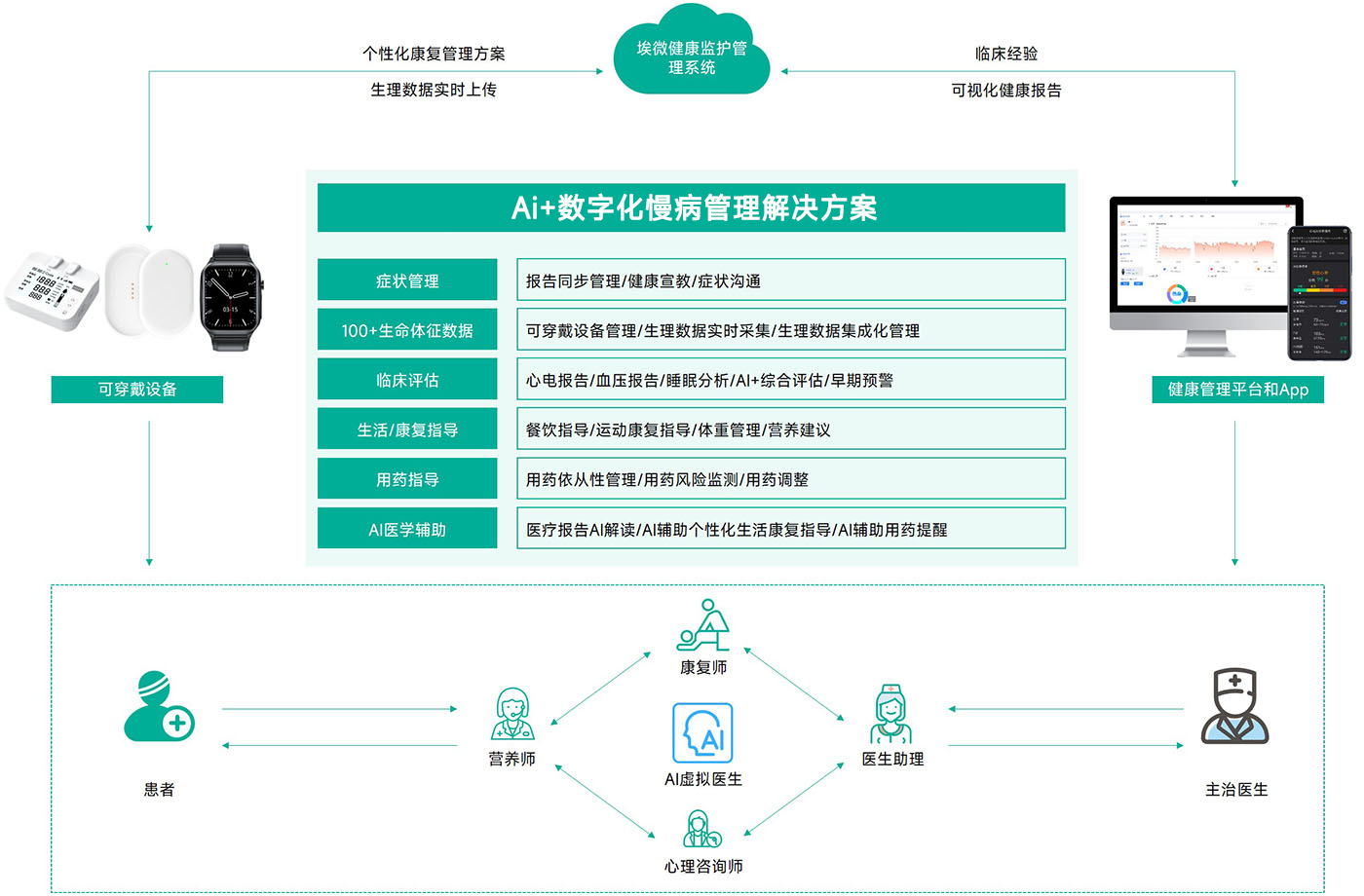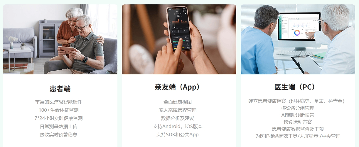 使用特定的远程通信技术和可穿戴智能设备,以及移动终端App软件等,收集病人疾病和健康数据信息,根据需求实时或准时传输给远端医疗服务的医生。